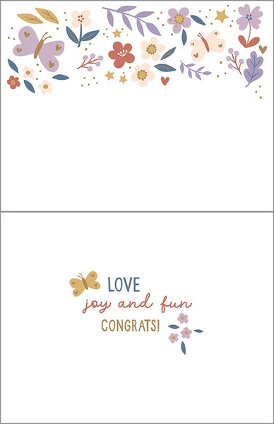 Greeting card with envelope Sweet baby girl Love joy and fun Congrats! Embellished with foil Folded size: 4.25" x 5.5" (A2). Proudly made in the U.S.A.