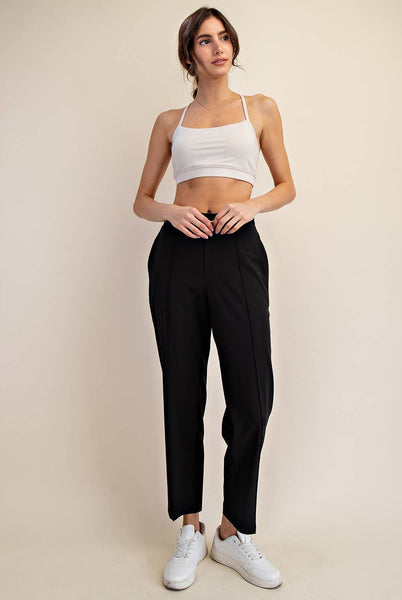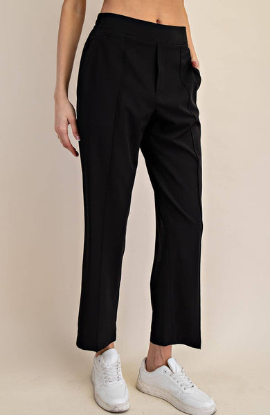 -lElevate your wardrobe with these ankle trousers in lightweight crinkled woven fabric. Featuring a mid-rise waistband (flat front, stretchy back) and a relaxed, straight fit, they effortlessly transition from work to weekend with a simple shoe change. Features: - Crinkled woven fabric - Lightweight - Relaxed fit - Straight pant - Ankle length - Mid-waist / Mid-rise - Pintuck details - Easy pull-on style - Elastic waistband (flat in front and stretchy in back) - Side pockets Model is 5'8" and wearing size Small. Fabric: 90% Polyester, 10% Spandex