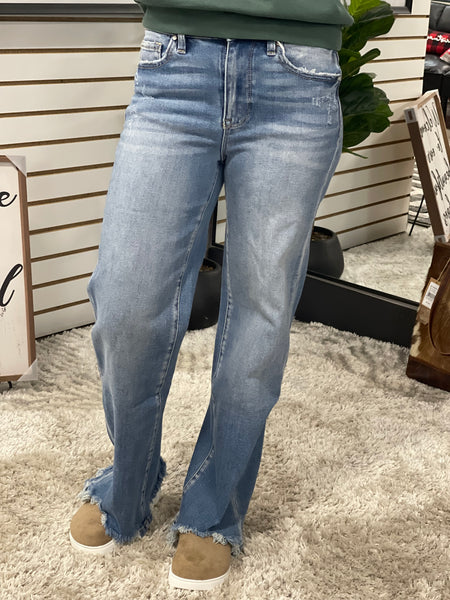 HIGH RISE STRETCH WIDE LEG W/ DESTROYED HEM JEANS