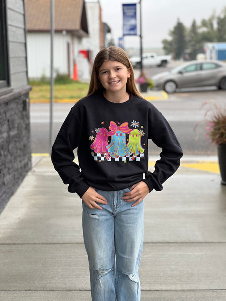 Embrace the enchanting spirit of Halloween with the Bright and Colorful, Retro Halloween Ghosts, Checkered Sweatshirt. This delightful sweatshirt is designed to keep you cozy while making a bold statement, featuring whimsical, Halloween-themed graphics that are perfect for the season.