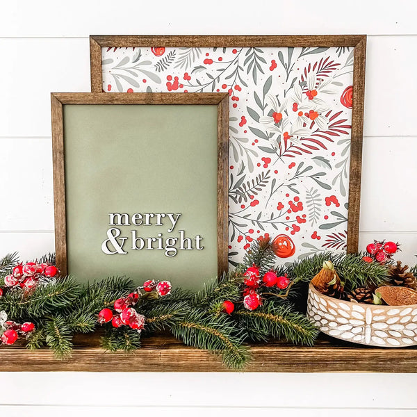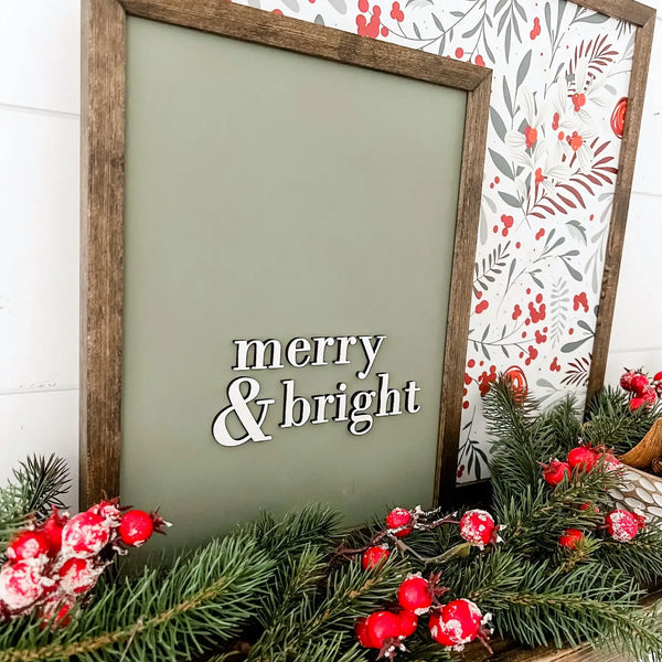 Handmade Christmas wood sign with Merry & Bright wording that is laser cut, giving each sign an added unique dimension. The background color is green in color. Framed in the stain color of your choice from the options provided. - Size: see variations. Add about 1/2" to each side to include frame in measurement. - Comes with hardware to hang your sign.