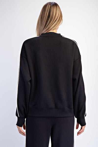 Crafted from luxurious, silky-soft Modal Scuba fabric. Featuring sleek piping details and a luxurious feel, it's the perfect blend of comfort and polish for daily wear. Features: - Modal poly span scuba fabric - Silky smooth and lightweight - 4-way stretch - Relaxed fit - Long sleeve top - Mock neck - Dropped shoulder - Double-stripe piping details - Thumbhole details Model is 5'8" and wearing size Small. Fabric: 48% Modal, 45% Polyester, 7% Spandex