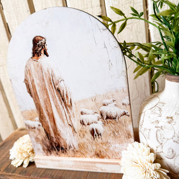 Jesus with Sheep Arched Wood Sign Shelf Sitter