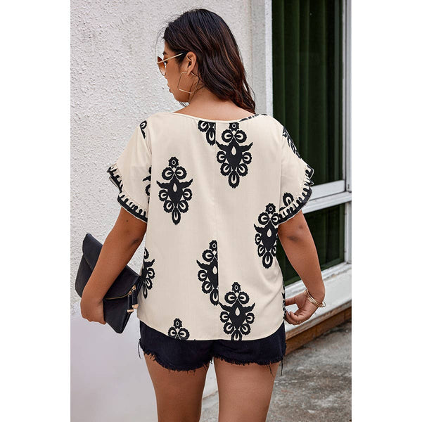 Plus Printed Ruffle Hem Wide Round Neck Blouse
