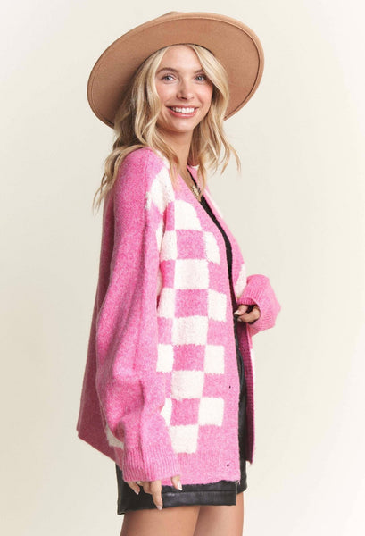 PLUS SIZE BUTTON DOWN PUFF CHECKER SWEATER CARDIGAN WITH POCKETS.