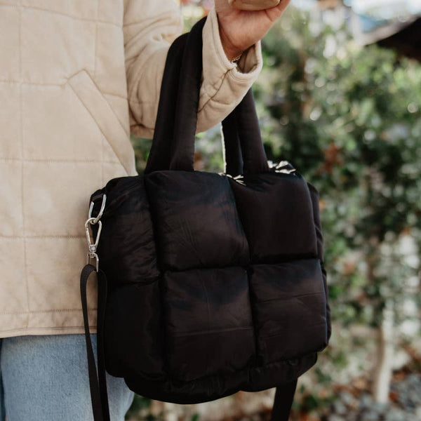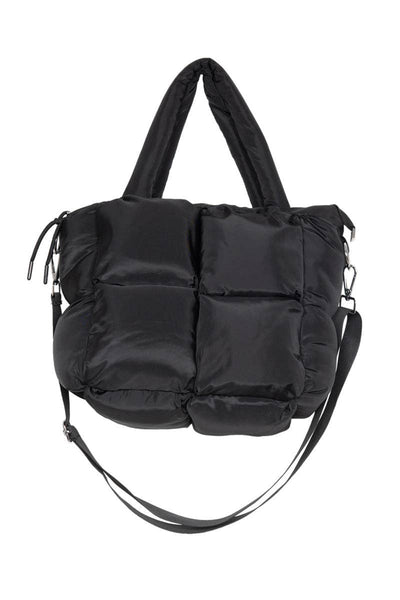 14" x 12" x 7.5" 100% polyester puffy quilted material zipper closure 17" handle straps magnetic clasp closure interior zipper pocket detachable optional over-the-shoulder strap Extends to 47"