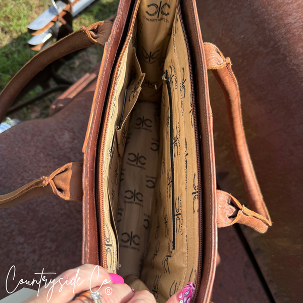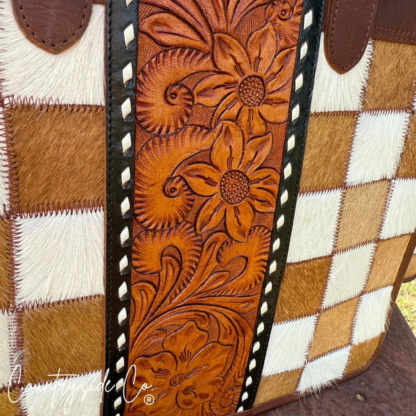 Virginia Cowhide Checkered Tote Handbag by Countryside Co. is the perfect statement bag. It is large enough to carry everything you need and still is easy to carry with style. It has cowhide checkered with tooled leather front with a leather back. The back has a zipper compartment and the inside has two side pockets and one zipper side pocket. Virginia has zipper closure to keep everything in place and a detachable adjustable shoulder strap. Made with genuine leather.