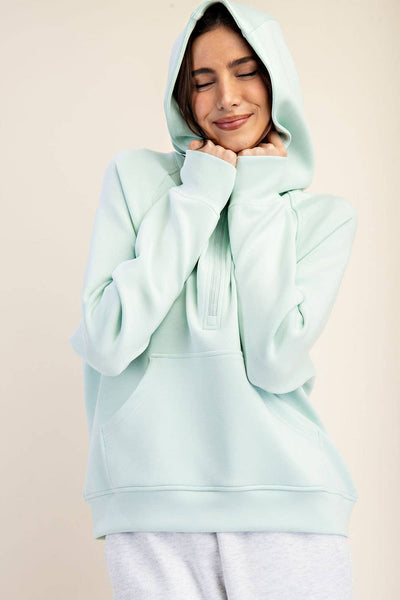 Features: - Modal Poly Span Scuba Fabric - Silky smooth and Lightweight - Slightly cropped - Relaxed fit / Oversized - Hoodie - Quarter zipper closure - Kangaroo pocket - Thumbhole detail Model is 5'8" and wearing size Small.