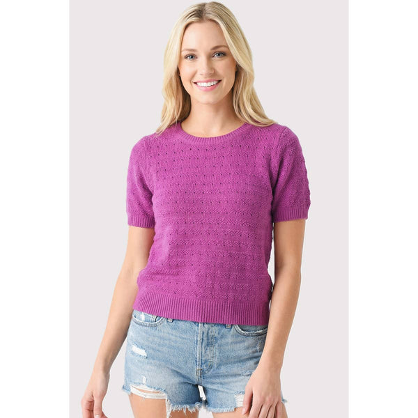 POINTELLE STRIPED, CREW NECK, SHORT SLEEVE SWEATER
