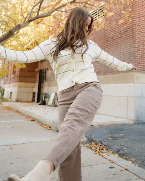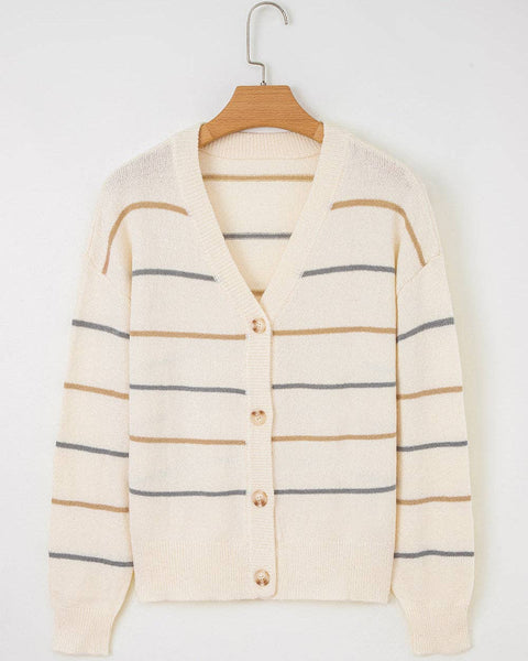 Color and comfort team up in the Lily Cardigan Sweater, delivering a relaxed drop-shoulder shape and a cheerful palette that brightens everyday outfits. This women’s cardigan is knitted from 100% acrylic with a buttoned front and V neckline for easy layering over tees and blouses. Long sleeves, soft hand feel, and a versatile length make it a practical styling piece that adds personality without sacrificing wearability. Perfect as a statement layer or casual sweater top for shoppers who want a cozy cardigan that pairs quickly with denim, dresses, and office basics. Key Features: • Multicolor stripe layout that adds visual interest while staying easy to style • Drop-shoulder construction for a relaxed silhouette that layers over varied tops • V-neck and buttoned front for adjustable coverage and simple outfit changes • Soft acrylic knit designed for comfort, resilience, and everyday use • Long sleeves and mid-hip length for season-spanning versatility Construction & Materials: • Materials Used: 100% Acrylic.