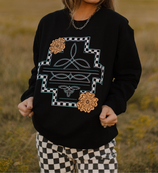 Feel trendy and chic with our Little Country Little Hood Pullover! Featuring a checked aztec graphic, viral bootstitch, and two tooled leather flowers, this Gildan pullover is the perfect balance of style and comfort. Get ready to turn heads with this effortlessly cool piece!