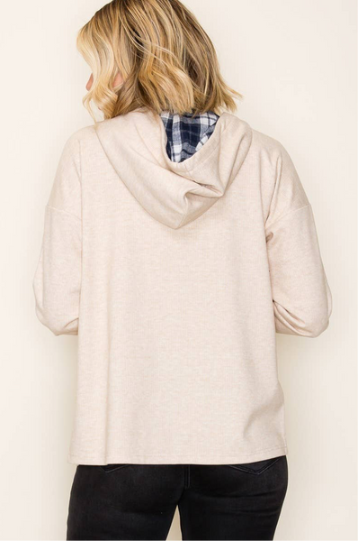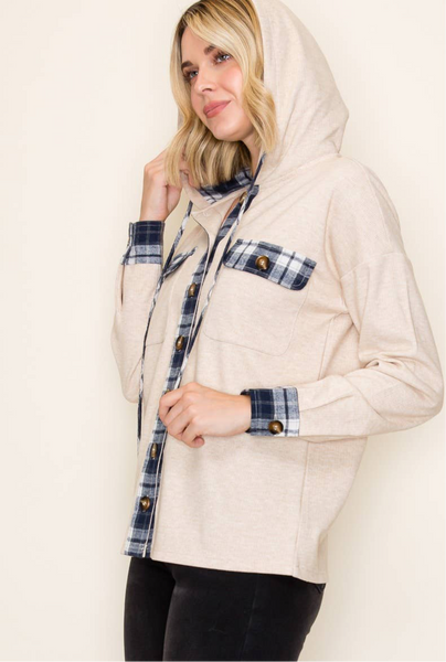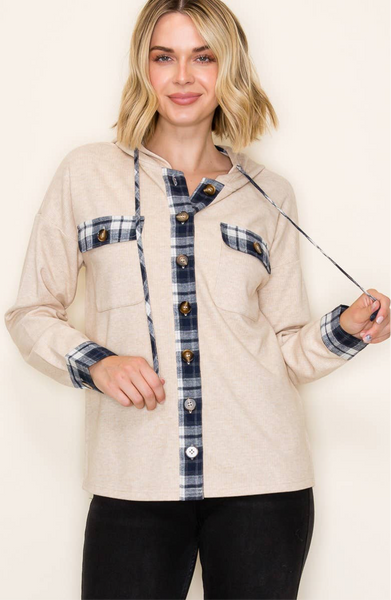 PLAID CONTRASTED, LONG SLEEVE, BUTTON DOWN, BRUSHED KNIT HOODIE SHACKET
