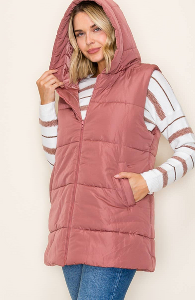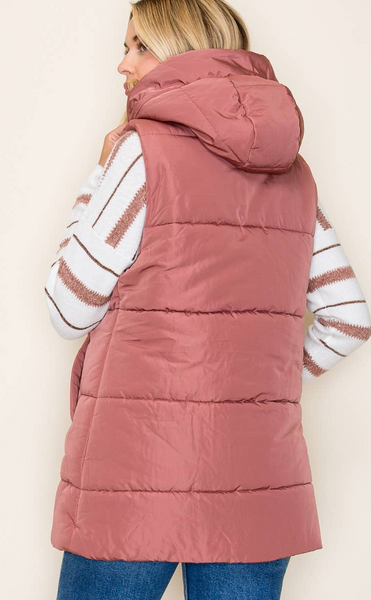 HOODED SOLID DUSTER PUFFER VEST - Marsala